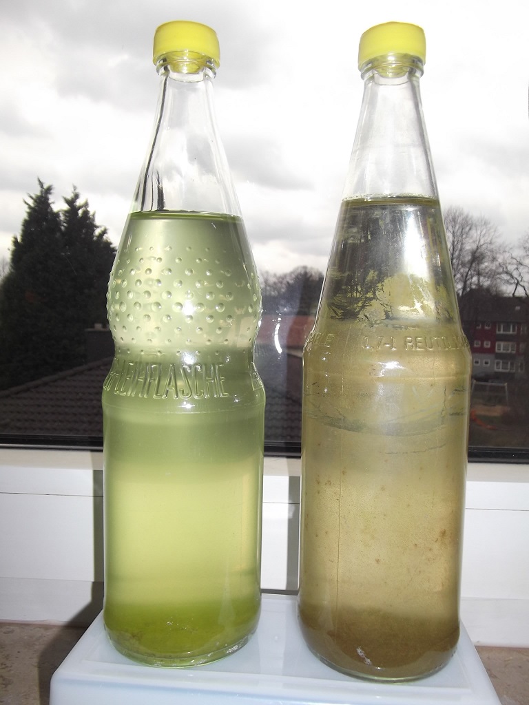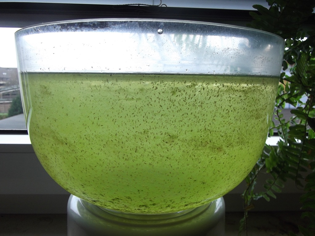 bei den Bachflohkrebsen hat sich in Sachen Vermehrung erst nichts getan. Vor vierzehn Tagen habe ich die Fütterung auf zusätzliche rote Mückenlarven umgestellt und eine Heizung installiert, um die Temperatur auf 25° zu bringen. Jetzt habe ich das erste Mal Nachwuchs gesehen. Die Cyclops/Wasserflöhe stelle ich in ihren Schüsseln auf die Fensterbank, letzte Woche war einige Tage Sonne und die Schüsseln sind jetzt sehr schön veralgt, was die Cyclops gerne fressen. Ich habe auch in Flaschen grünes Wasser gezogen. Am Anfang ist es mir nicht gelungen, nur Schwebealgen in die Flaschen zu bekommen, die Flaschen sind immer veralgt. Ich habe sie dann immer wieder in neue saubere Flaschen mit ein wenig Aquarienwasser umgeschüttet bis sich in einer Flasche nur noch Schwebealgen gebildet haben. Die habe ich sich erstmal eine Zeit lang entwickeln lassen und diese Flasche dann halbiert auf zwei verteilt und mit wenig Aquarienwasser aufgefüllt. Ich fülle sie jetzt langsam alle paar Tage mit etwas mehr Aquarienwasser, dann habe ich genug zum Verfüttern und kann die entnommene Menge auffüllen ohne dass sie in andere Algen umkippt. Also habe ich jetzt auch noch ein zusätzliches, sehr kleinteiliges Futter für die Flöhe. ![]() schön veralgt ![]() diese Schüssel habe ich kurz vorher sauber gemacht, sie fängt gerade erst an zu veralgen ![]() eine etwas kleinere Schüssel, auch innerhalb von drei Tagen Sonne komplett zugealgt ![]() die Farbe täuscht, auch die rechte Flasche ist grün, aber eben keine Schwebealgen, wie man am klaren Wasser sieht, die linke Flasche hingegen ist trüb von Schwebealgen Liebe Grüße Hans |